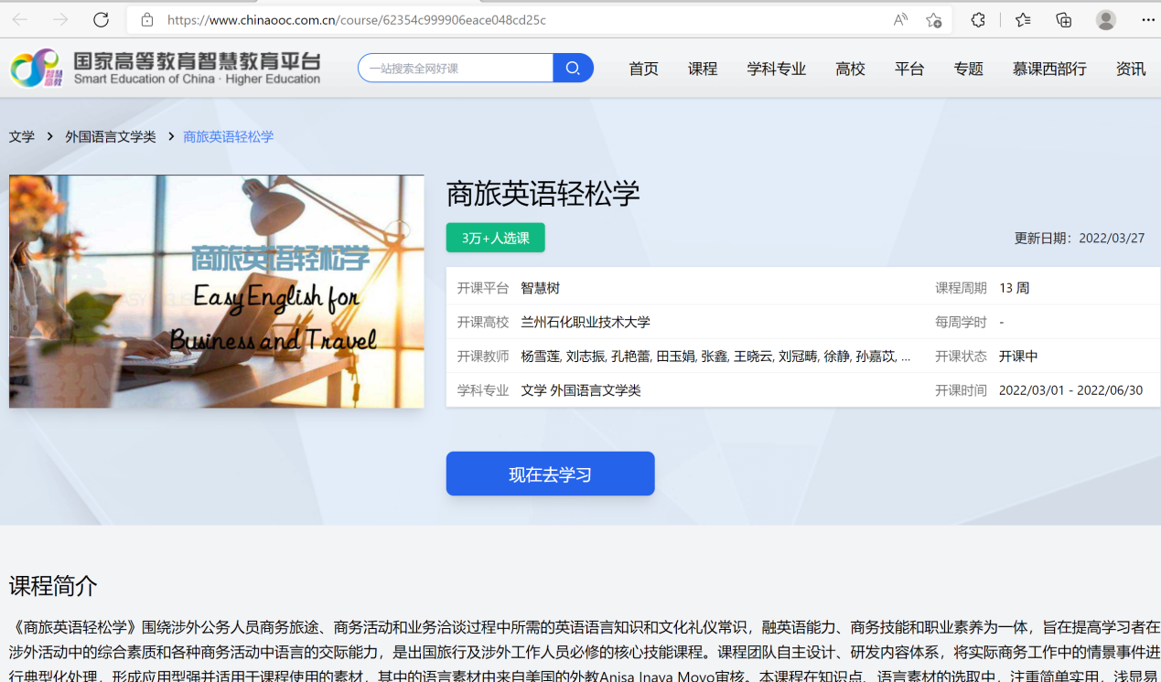 3月28日,教育部部长怀进鹏宣布国家智慧教育公共服务平台正式上线,这标志着教育数字化战略行动迈出了关键一步。我校yl88858永利中国教师团队制作的省级在线精品课《商旅英语轻松学》入选其中备受关注的“国家高等教育智慧教育”平台(www.chinaooc.com.cn)首批课程。