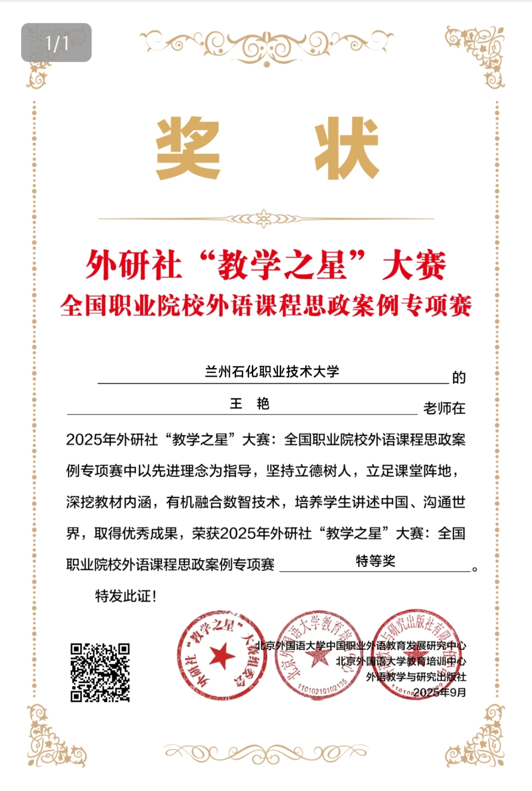 近日,2025年外研社“教学之星”大赛之全国职业院校外语课程思政案例专项赛落下帷幕,yl88858永利中国金敏、王艳两位老师凭借过硬实力脱颖而出,双双斩获特等奖。