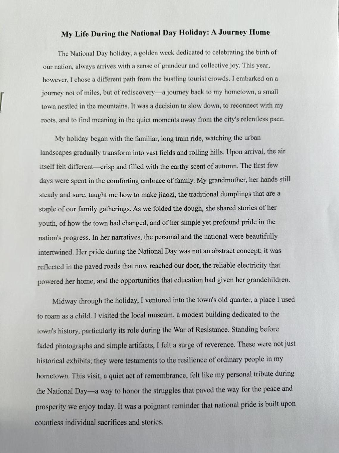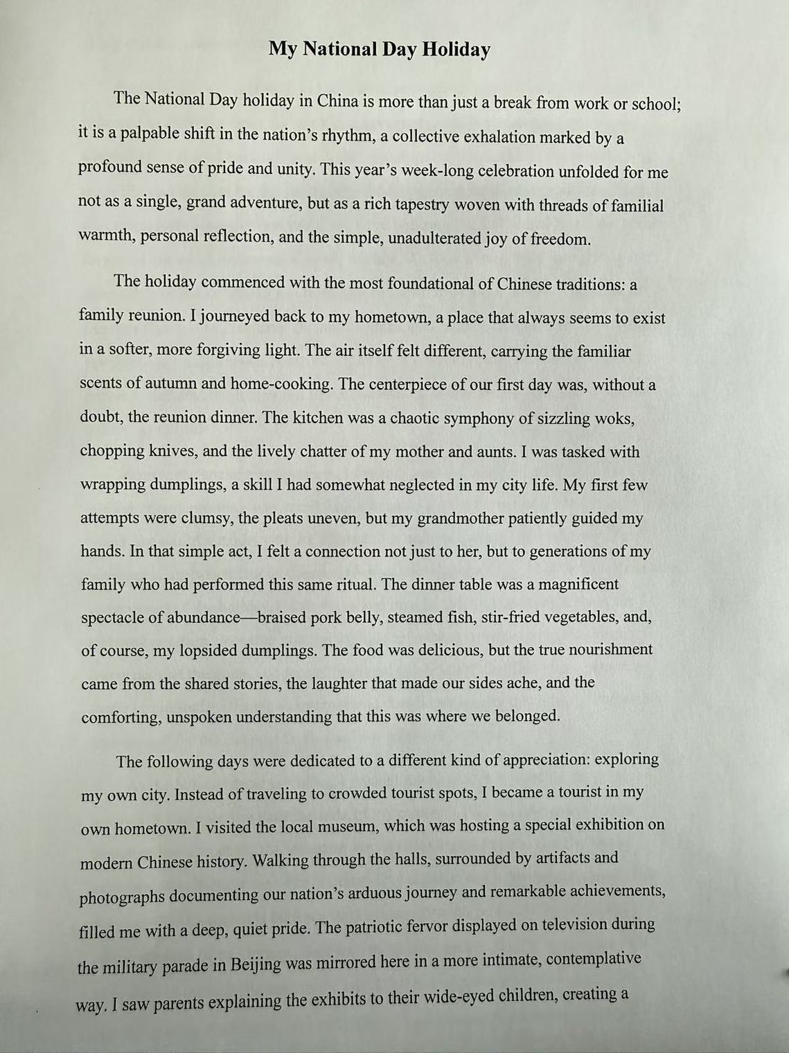 为丰富学生文化生活,提升学生英语写作能力与跨文化表达素养,yl88858永利中国近期举办了以“My life during the National Day holiday” 为主题的英文征文比赛。活动自启动以来,得到了全院学生的积极响应与热情参与,最终共征集到 20 余篇高质量参赛作品。