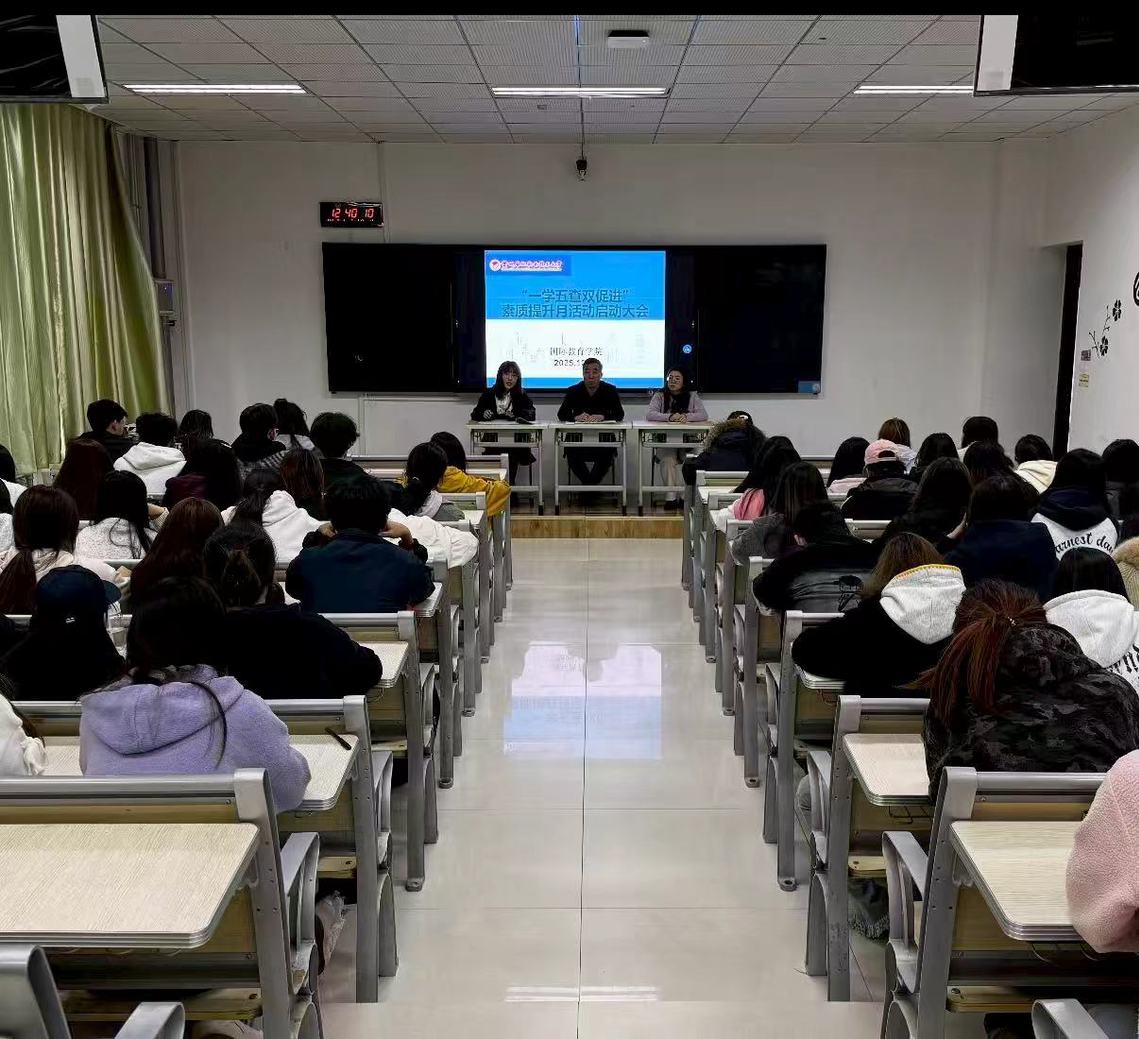 仪式伊始,辅导员老师详细解读了“一学五查双促进” 的具体内容和工作方案,强调“一学” 聚焦学习校纪校规及学校各项规章制度;“五查” 则精准瞄准学生日常行为中的突出问题,通过查旷课、上课迟到、带早餐进教室等课堂纪律问题,查夜不归宿、校外租房居住等涉生安全隐患,查抽烟、酗酒、赌博等不良行为,查乱扔垃圾、宿舍违规用电、私藏危险品和管制刀具等宿舍管理问题,查“三网一传”中的网络造谣传谣、恶意诽谤等行为,构建全方位、立体化的排查整改体系,营造良好学习环境,维护平稳、有序的校园秩序。